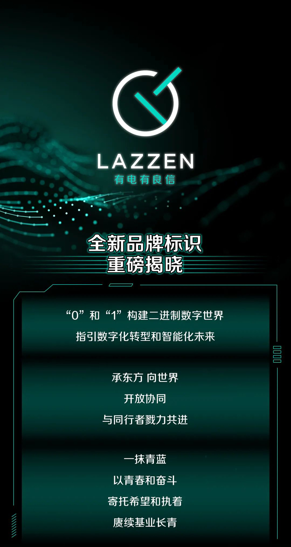 全新品牌LOGO呈简约而富有科技感的开关造型,由“0”和“1”两个核心元素组成,寓意二进制数字世界,标志着电气行业的数字化转型和智能化未来;右上角开口象征开放与协同,承载着良信与同行者勠力共进的愿景;图案中的青色元素则取自于东方传承,意味着以人为本,赓续基业长青。